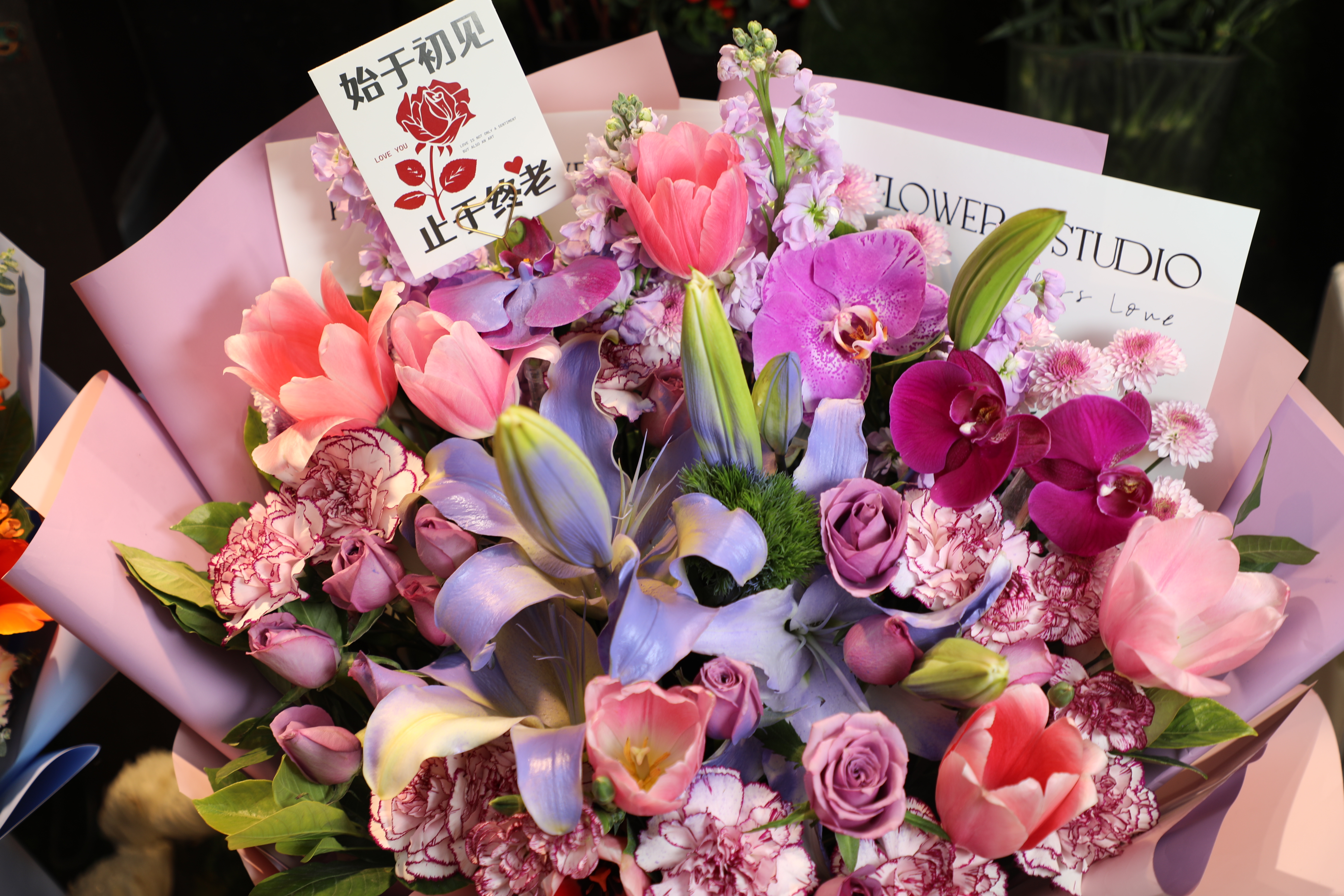 元宵節(jié)前后兩天,鮮花銷量明顯增長。為了更好地滿足顧客的需求,從嬌艷的玫瑰、浪漫的百合,到寓意吉祥的蝴蝶蘭、富貴竹,商戶準備的貨品應有盡有。這其中,玫瑰是絕對的“主角”,經(jīng)典的紅玫瑰、復古色調的‘卡布奇諾’和清新甜美的‘蜜桃雪山’等在市場里都能看到,商戶都在忙著制作花束。