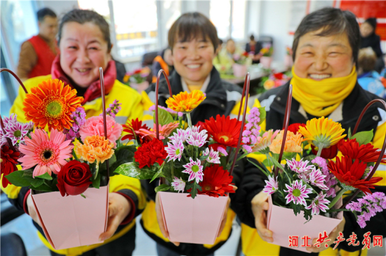 3月5日,河北省秦皇島市海港區(qū)文化路街道人民里社區(qū)愛“新”驛站內(nèi),新就業(yè)群體婦女展示插花作品。