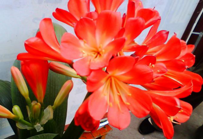 君子蘭 葉片濃綠色,較寬厚,呈長帶形,花大而直立,通常十?dāng)?shù)朵著生在傘形花序上,形成一大花團(tuán),橙紅色,十分鮮艷,正值春節(jié)前后開花,深受人們喜愛。