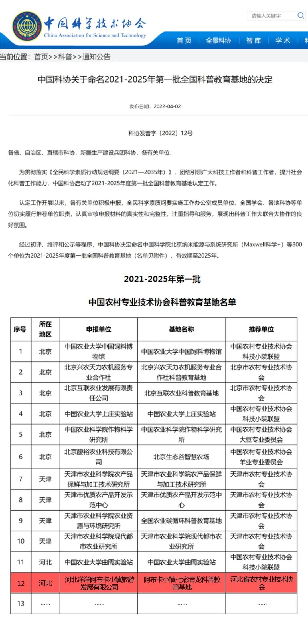 近日,中國(guó)科協(xié)辦公廳發(fā)布《關(guān)于2021-2025年全國(guó)科普教育基地第一批認(rèn)定名單的公示》,經(jīng)過(guò)嚴(yán)格組織推薦、材料申請(qǐng)初評(píng)、專(zhuān)家委員會(huì)終評(píng)、網(wǎng)上公示等程序,阿布卡小鎮(zhèn)·七彩青龍被認(rèn)定為第一批“全國(guó)科普教育基地”稱(chēng)號(hào),是秦皇島市唯一獲此榮譽(yù)的單位。