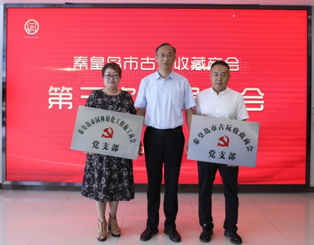 秦皇島市工商聯(lián)副主席、非公(商)協(xié)會黨委書記王利輝為秦皇島市古玩收藏商會黨支部、秦皇島市園林綠化工程施工商會黨支部授牌