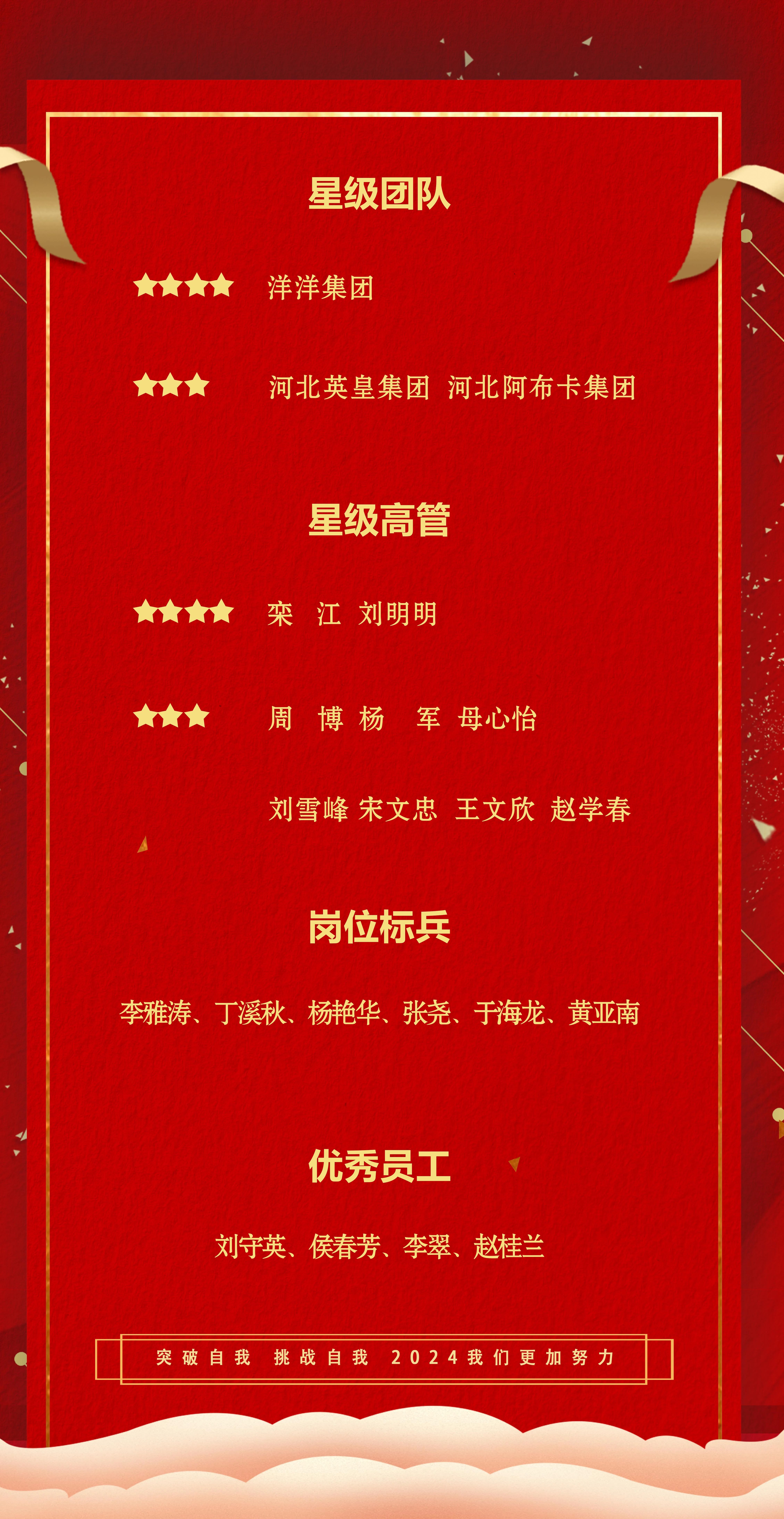 2024年1月19日,河北英皇集團、河北阿布卡集團、秦皇島洋洋集團表彰大會在集團會議室成功召開,集團董事局主席劉洋出席會議,集團高管團隊、榮獲年度星級團隊、星級高管、崗位標兵、優(yōu)秀員工齊聚一堂,共同慶祝這一美好時刻。