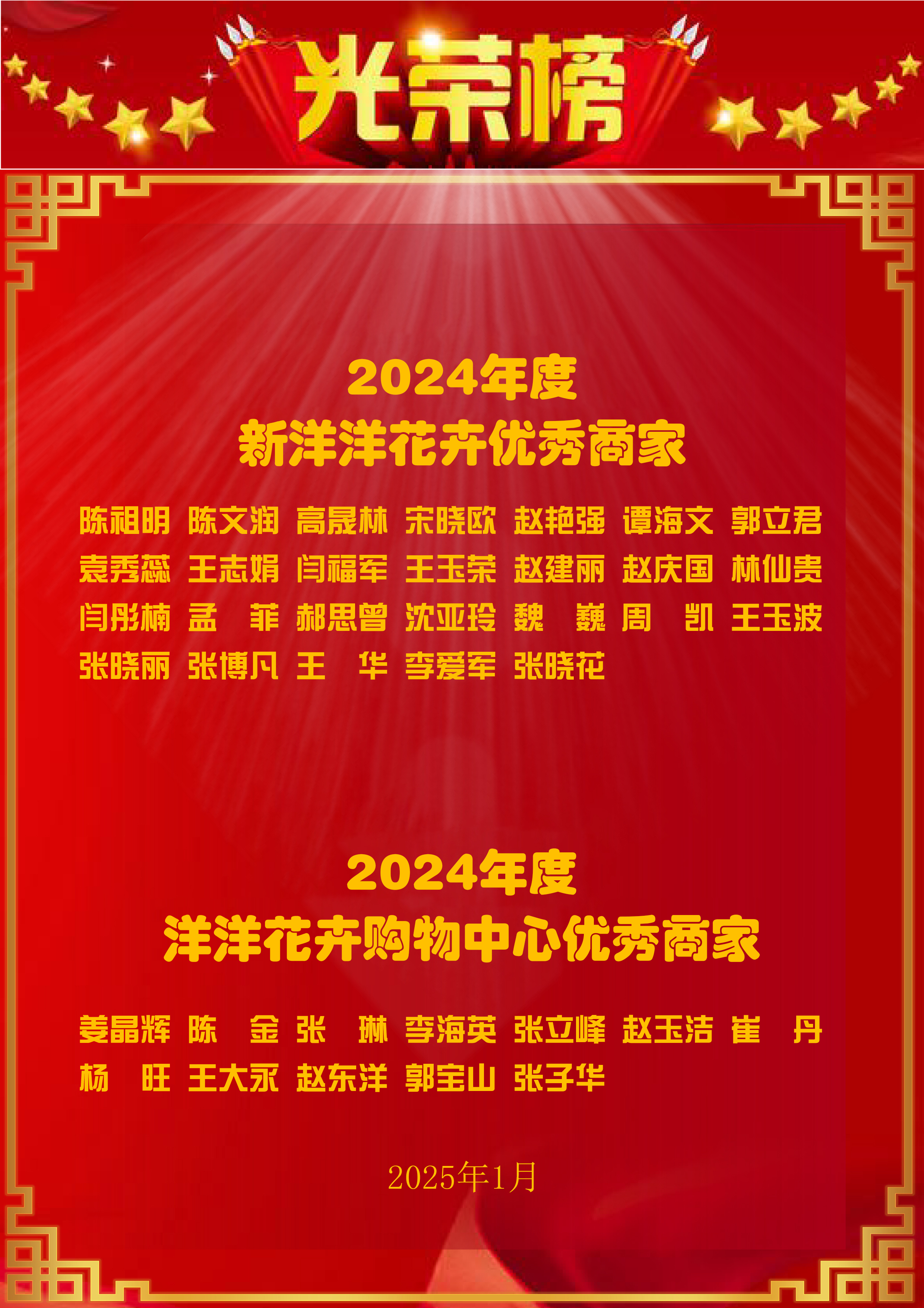 回首過去的一年,我們攜手并肩、砥礪奮進(jìn),展現(xiàn)出“洋洋人”堅(jiān)韌不拔的精神和無窮的創(chuàng)造力。在市場(chǎng)的風(fēng)云變幻與激烈競(jìng)爭中,廣大商家積極維護(hù)市場(chǎng)經(jīng)營秩序,堅(jiān)守誠信經(jīng)營的原則,踴躍承擔(dān)社會(huì)責(zé)任,用實(shí)際行動(dòng)鑄就了“洋洋”品牌,為市場(chǎng)的繁榮穩(wěn)定注入了強(qiáng)大動(dòng)力。表彰大會(huì)上,集團(tuán)董事局副主席、洋洋花卉總經(jīng)理劉明宣讀獲獎(jiǎng)名單,集團(tuán)董事局副主席啜磊致賀詞,并與集團(tuán)董事局副主席欒江、集團(tuán)董事局副主席修文佳共同為年度優(yōu)秀商家頒發(fā)證書及錦旗。