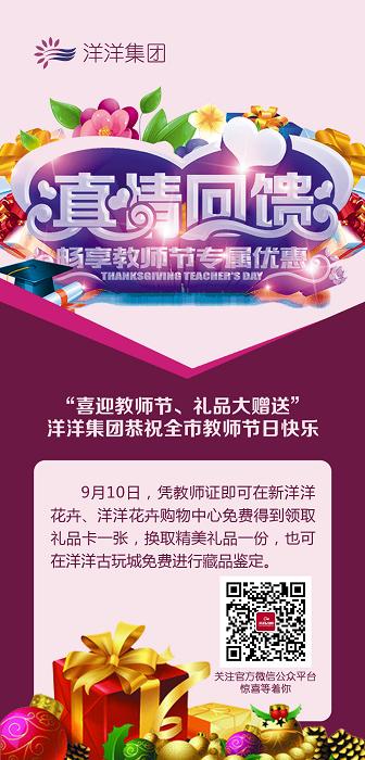 “喜迎教師節(jié)、禮品大贈(zèng)送”,洋洋集團(tuán)恭祝全市教師節(jié)日快樂!9月10日,憑教師證即可在新洋洋花卉、洋洋花卉購物中心免費(fèi)領(lǐng)取精美禮品一份。也可憑教師證即可在洋洋古玩城免費(fèi)進(jìn)行藏品鑒定,機(jī)會(huì)難得!