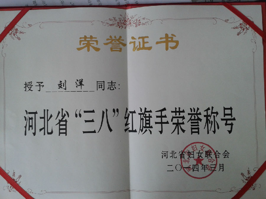 洋洋集團(tuán)總裁劉洋榮獲由河北省婦女聯(lián)合會(huì)授予的河北省“三八”紅旗手榮譽(yù)稱號(hào)