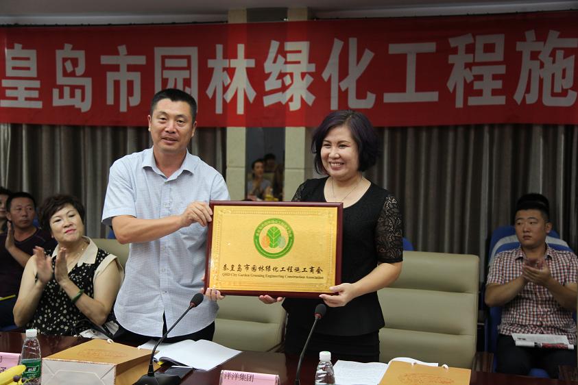 市民政局行政審批科科長(zhǎng)李占勇為秦皇島市園林綠化工程施工商會(huì)頒牌
